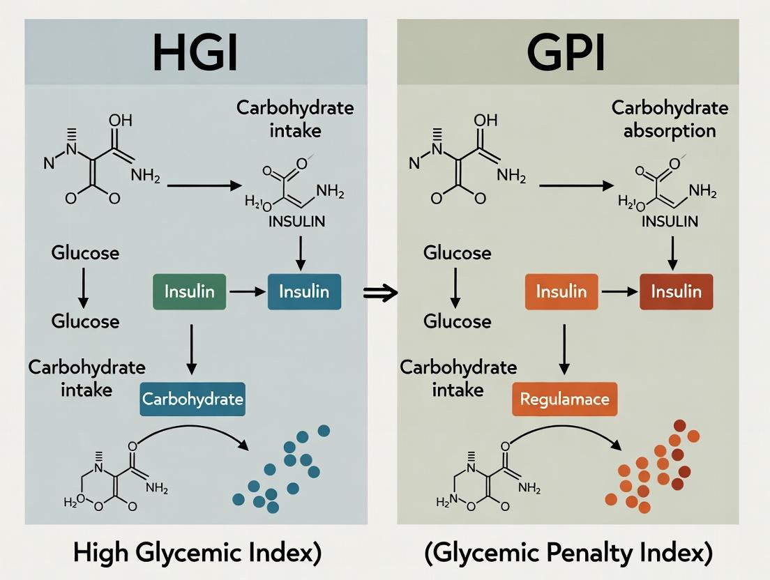 This comparison guide evaluates two sophisticated metrics for assessing the physiological glucose response to interventions: the Glycemic Penalty Index (GPI) and the Hybrid Glycemic Index (HGI). The analysis is framed within the critical research thesis of determining a potential unified benchmark for regulatory and drug development applications.